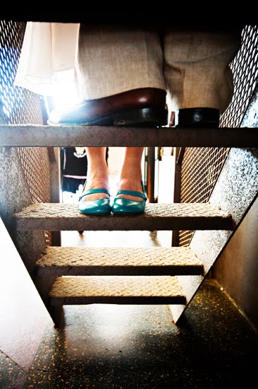 christine wore cute blue shoes with her wedding dress. an awesome color accent!